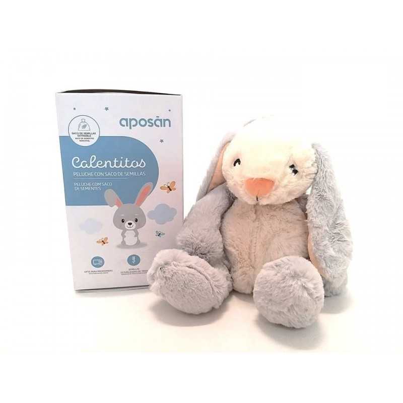 Calentitos Conejo Aposán son unos peluches de animales con saco extraíble de semillas esterilizadas de trigo en el interior, aptos para el microondas, conservan el calor durante un largo periodo de tiempo y tienen un efecto relajante instantáneo. Son de fácil limpieza gracias a su saco extraíble.