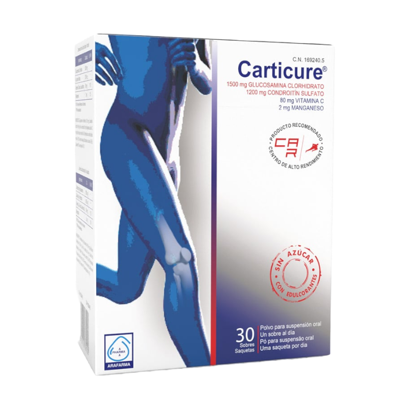 Glucosamina (clorhidrato) 1500 mg, controitina (sulfato) 1200 mg, ácido ascórbico 80 mg; manganeso (sulfato) 2 mg, edulcorante: sorbitol (E-420), regulador de la acidez: ácido cítrico (E-330), aroma de naranja, edulcorante: sucralosa (E-955), colorante: FDC yellow.