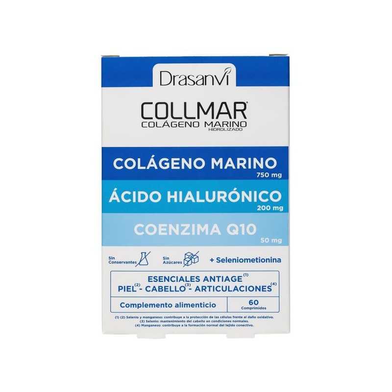 Colágeno Marino Hidrolizado Enzimaticamente (Contiene Pescado Tipo I, muy bajo peso molecular) 750 mg, Agente de carga (Celulosa microcristalina), Ácido hialurónico 200 mg, Coenzima Q10 50 mg, Extracto Seco Sol de Oro (Flor) (Helichrysum arenarium (L), vitexina 3%) 50 mg, Sulfato de Manganeso (Manganeso 32 %) 6,25 mg, Seleniometionina (Selenio 0,5%) 10 mg, Agente de carga (Sal Magnésica de Ácido Graso).