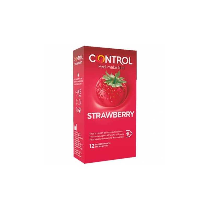 Preservativo de látex de caucho natural, anatómico de lados no paralelos, con depósito, lubricado con aroma de fresa y de color rojo. Anchura nominal 54 mm.