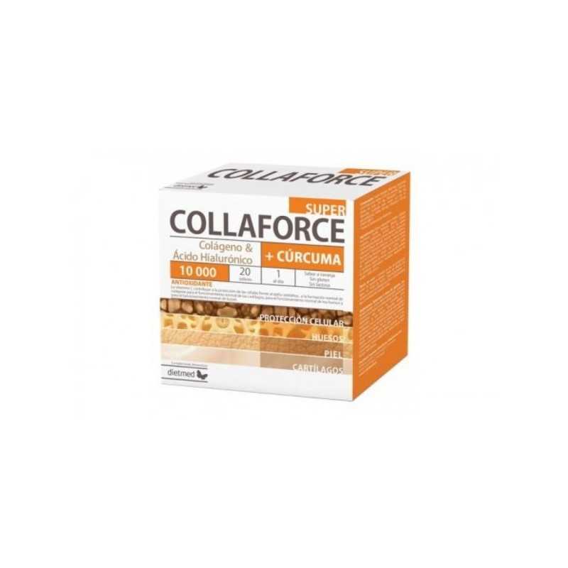 Super Collaforce + cúrcuma de Dietmed, es un complemento de colágeno enriquecido con cúrcuma para ayudar a la mejora y el cuidado de los huesos y favorecer el correcto estado de las articulaciones.