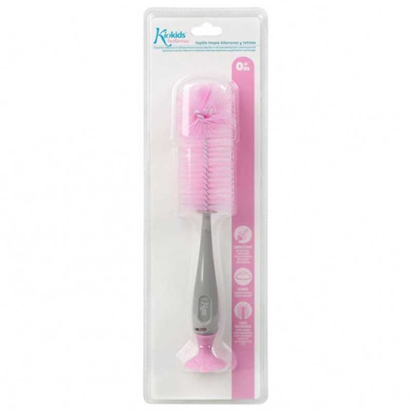 El cepillo limpiabiberones Kiokids permite limpiar con facilidad el interior de biberones y otros vasos gracias a su mango de fácil agarre y su extremo de cerdas sin esponja, más higiénico que otros materiales ya que no absorbe olores ni sabores y se mantiene inalterable.