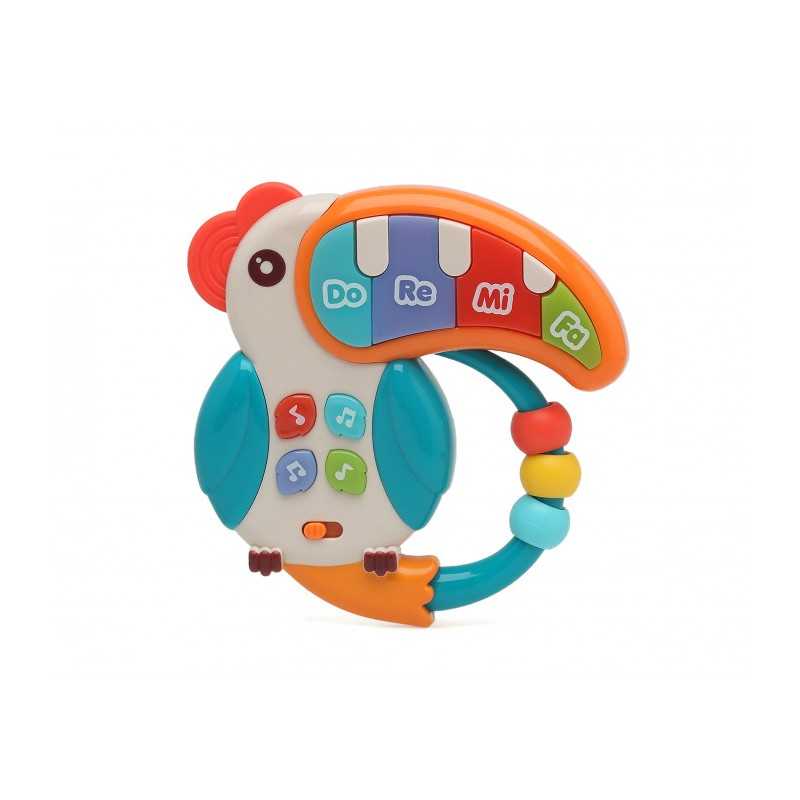 Desde luego este tucán aparte de ser bonito y muy colorido es perfecto para que el niño se pase el día tocándolo y aprendiendo música. Tiene las cuatro primeras notas musicales, así que ya puede hacer una melodía, solo le falta la letra…
