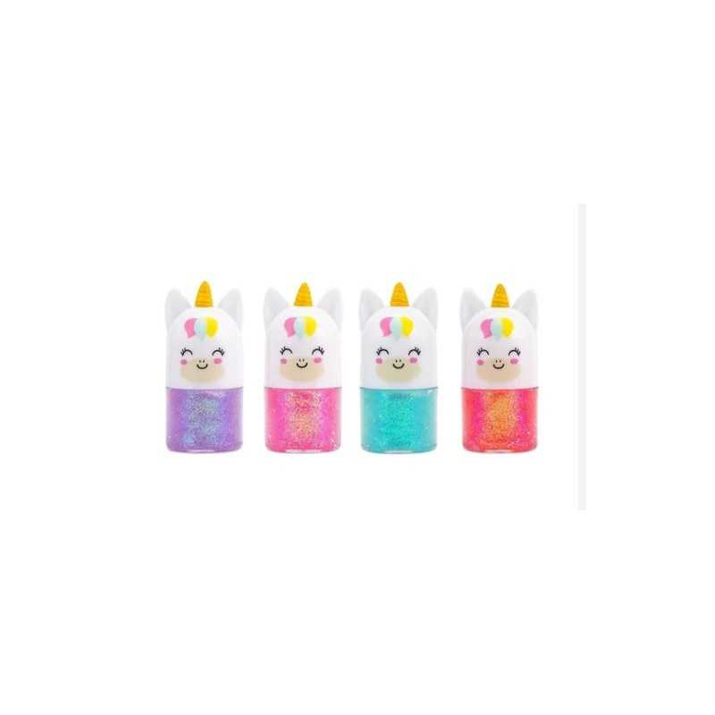 Purpurina para uso corporal y facial, presentada en un bote transparente con un tapón muy divertido con la cabeza de un unicornio feliz, especialmente diseñado para uso infantil. Está disponible en lila, rosa, turquesa y rojo.