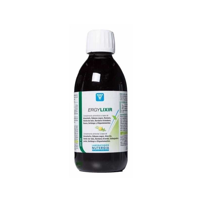 ERGYLIXIR esta compuesto por Alcachofa, Rábano negro, Romero, Diente de león, Bardana, Saúco negro, Solidago, Zumo de Arándano rojo y oligoelementos de origen marino, dentro de los cuales, Molibdeno y Selenio.