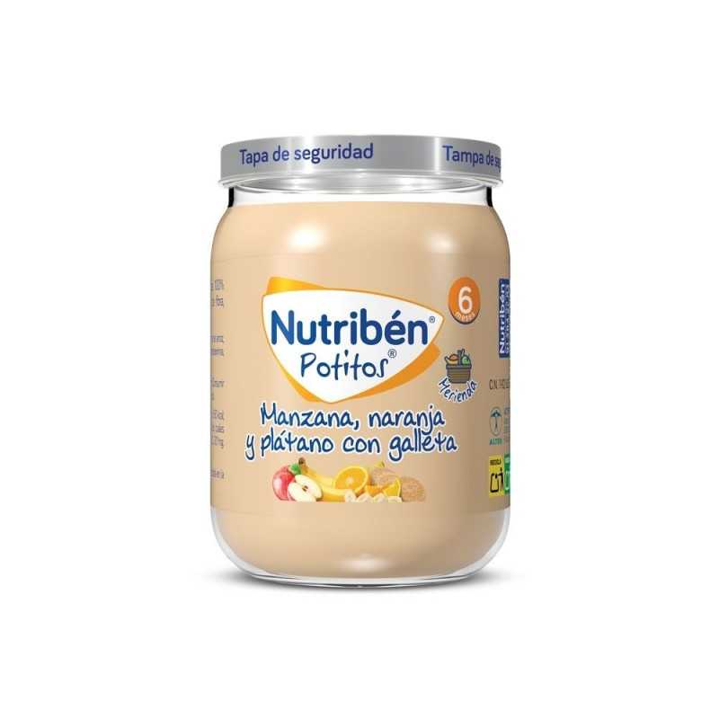 Nutribén® Manzana, naranja y plátano con galletas es un alimento infantil destinado para niños a partir del 6º mes.