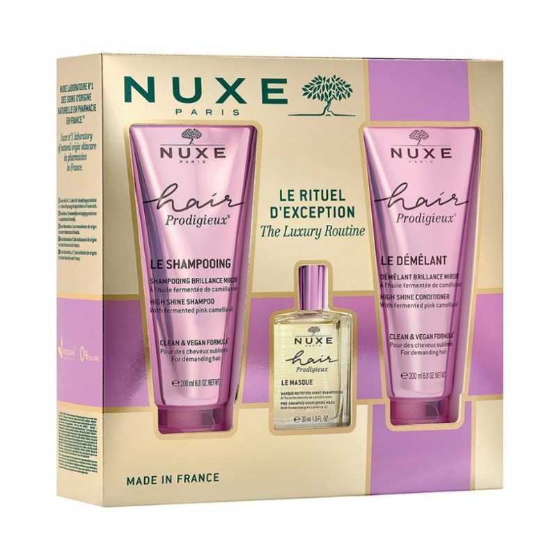 Transforma tu cabello con Hair Prodigieux® gracias al poder sublimador del aceite fermentado de Camelia Rosa. Descubre el excepcional ritual capilar Hair Prodigieux® para un cabello sedoso y lleno de brillo. Nuxe Cofre Navidad Hair Prodigieux El Ritual es una rutina de 3 tratamientos diseñada para transformar tu cabello. Este cofre destaca por su enriquecimiento con aceite de camelia rosa fermentado, que potencia sus propiedades reparadoras y nutritivas gracias a su proceso de fermentación. Además, todos los productos cuentan con la legendaria fragancia de Huile Prodigieuse, que envuelve el cabello en un ritual sensorial increíble.