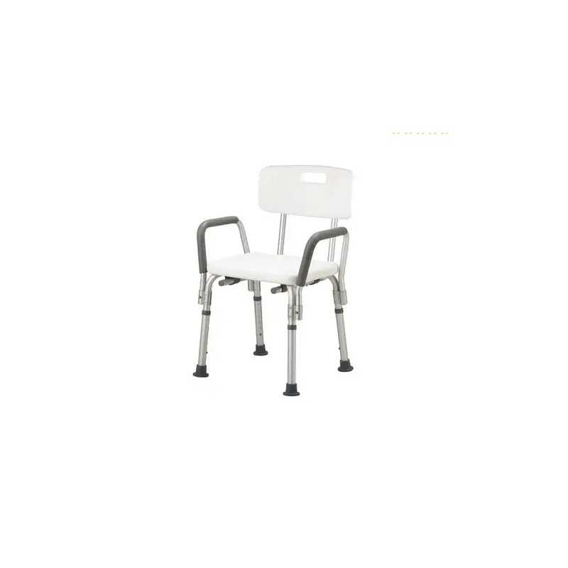 Silla de ducha con reposabrazos y patas ajustables en altura ideal para baño o ducha.