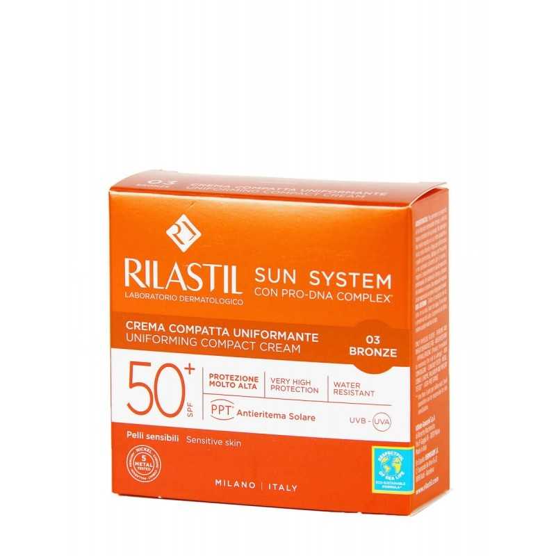 Rilastil Sun System Compacto SPF 50+ Bronze es un foto-maquillaje facial, protege la piel del sol, unifica el tono y corrige las imperfecciones propias de pieles con lunares, cicatrices, vitíligo o acné.