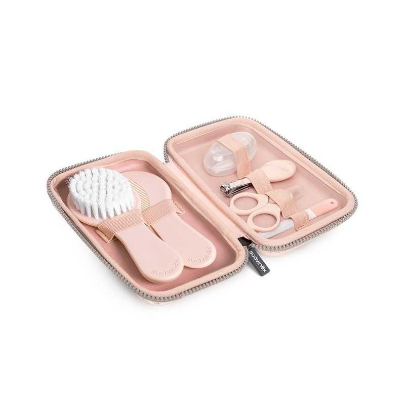 Set neceser para bebés con 6 productos esenciales para facilitar el cuidado diario y delicado que el bebé necesita desde el primer día. Contiene: neceser de material rígido e impermeable se cierra con cremallera. Muy práctico para transportar todos los accesorios de aseo bien ordenados, cepillo con fibras pobladas y muy suaves para peinar respetando el delicado cuero cabelludo, peine para peinar y eliminar nudos de pelo fino, cepillo dental de dedal de suave silicona, su forma de dedal está pensada para introducir el dedo y limpiar suavemente las encías y primeros dientes del bebé. Con cajita higiénica incluida. Tijeritas de reducido tamaño y punta redondeada, están especialmente pensadas para uñas muy pequeñas. Con funda protectora incluida. Lima específica para uñas finas y frágiles, ya que lima de forma muy delicada ayudando a evitar que se astillen. Cortaúñas que corta de una forma limpia en un solo golpe. Diseño ergonómico para manejar con precisión con una sola mano, mientras con la otra se sujeta al bebé.