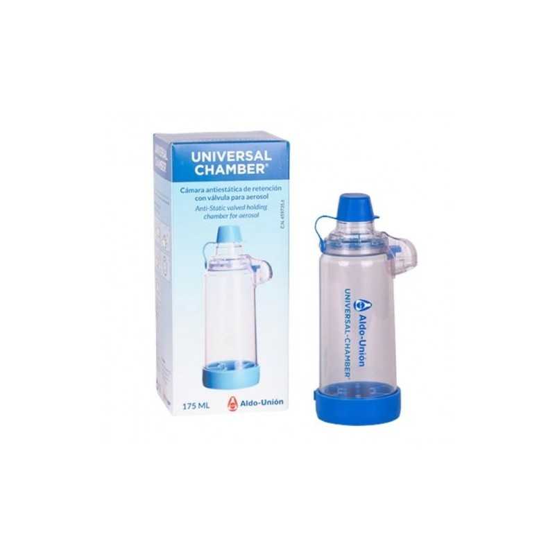 Universal Chamber Cámara de Inhalación es una cámara, estudiada y comprobada para que los pacientes asmáticos incapaces de coordinar la inspiración con la pulsación del aerosol puedan obtener el máximo beneficio terapéutico de los medicamentos inhalados. Reduce la precipitación orofaríngea del medicamento inhalado y está especialmente indicada en pacientes que deben efectuar repetidas inhalaciones de broncodilatadores y para reducir los efectos secundarios de los corticoides inhalados (candidiasis).