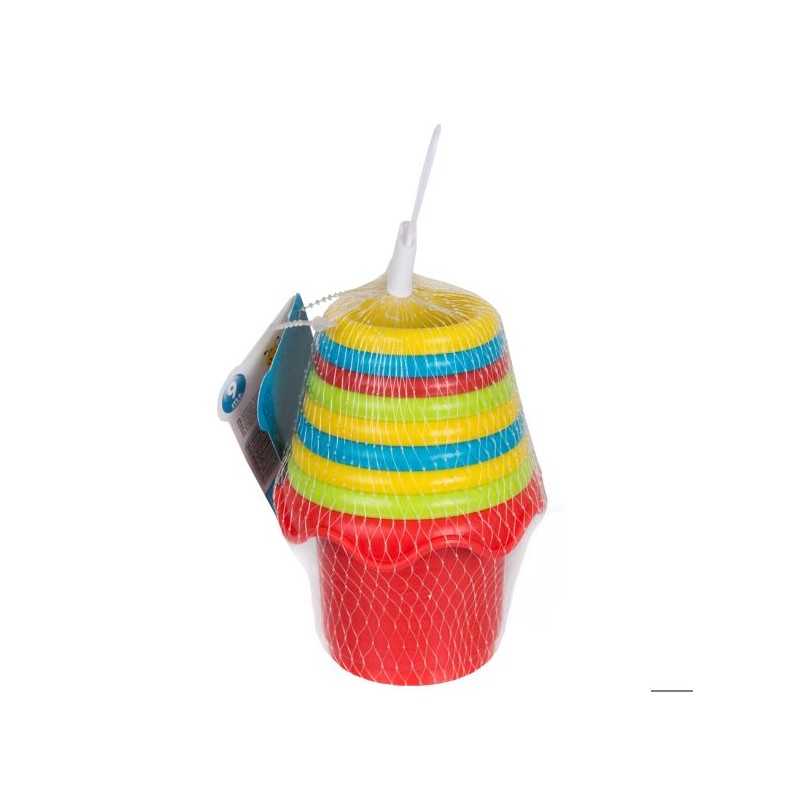Pack de 9 moldes de colores de diferentes tamaños, los moldes se unen entre sí, por lo que todo el conjunto ocupa poco espacio. Los lados y la parte inferior de cada elemento tienen una superficie elevada para dibujar varios estampados y patrones en la arena.